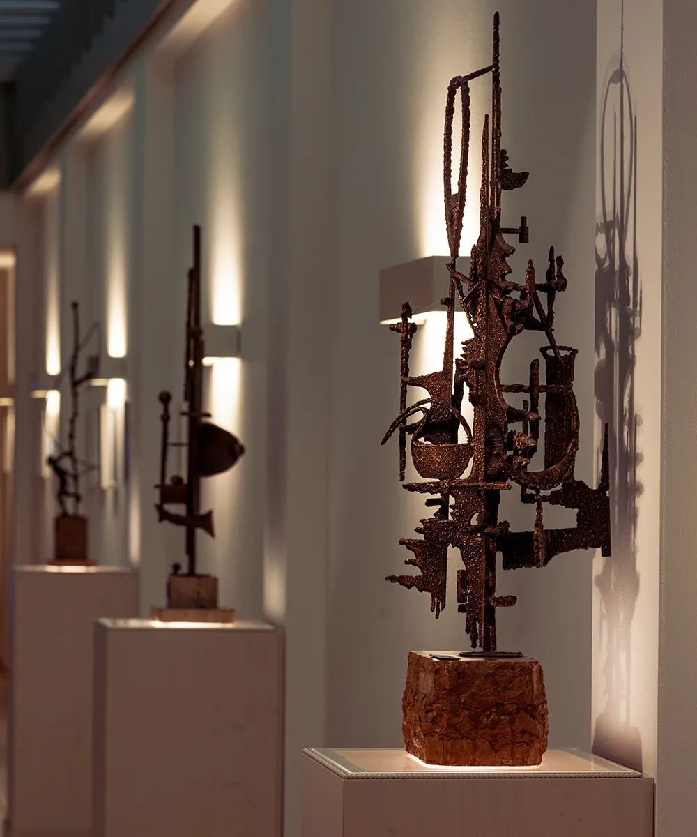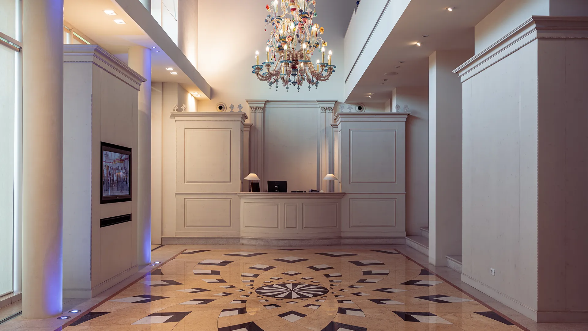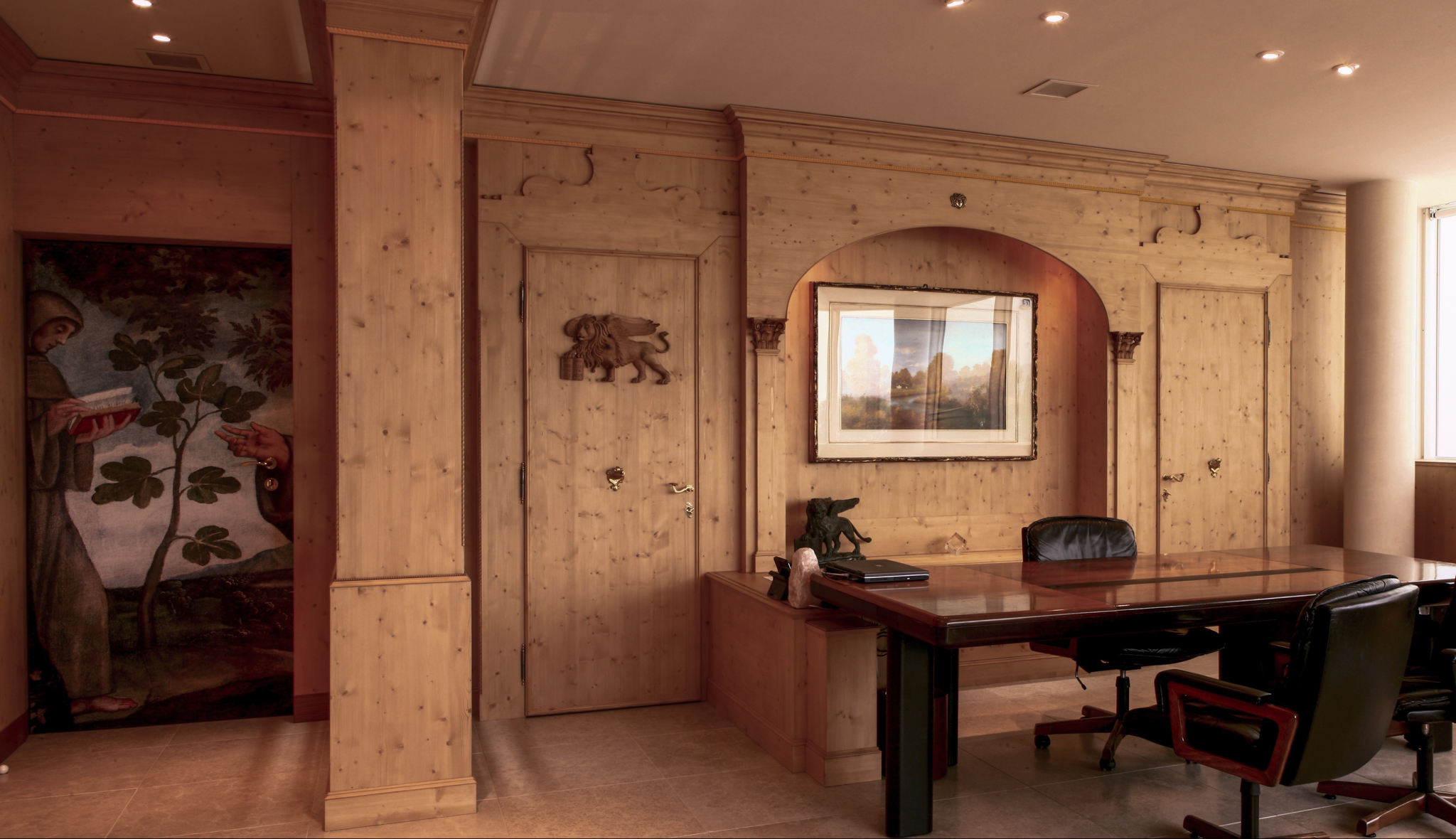 L’accoglienza inizia già nella reception, dove il pavimento in marmo intarsiato con disegni geometrici e i cristalli di Boemia creano un’atmosfera elegante, mentre le boiserie in legno donano calore e armonia agli spazi. Il nostro tocco si ritrova in ogni ambiente: dalle sale uffici dove il legno domina le pareti e gli arredi su misura, al museo aziendale, fino ai corridoi dove delle opere d’arte sono state collocate in nicchie dedicate per restituire loro la giusta importanza. Ogni spazio diventa così un percorso che celebra il lavoro e la cultura veneta, trasformando la sede in un luogo capace di accogliere e ispirare.