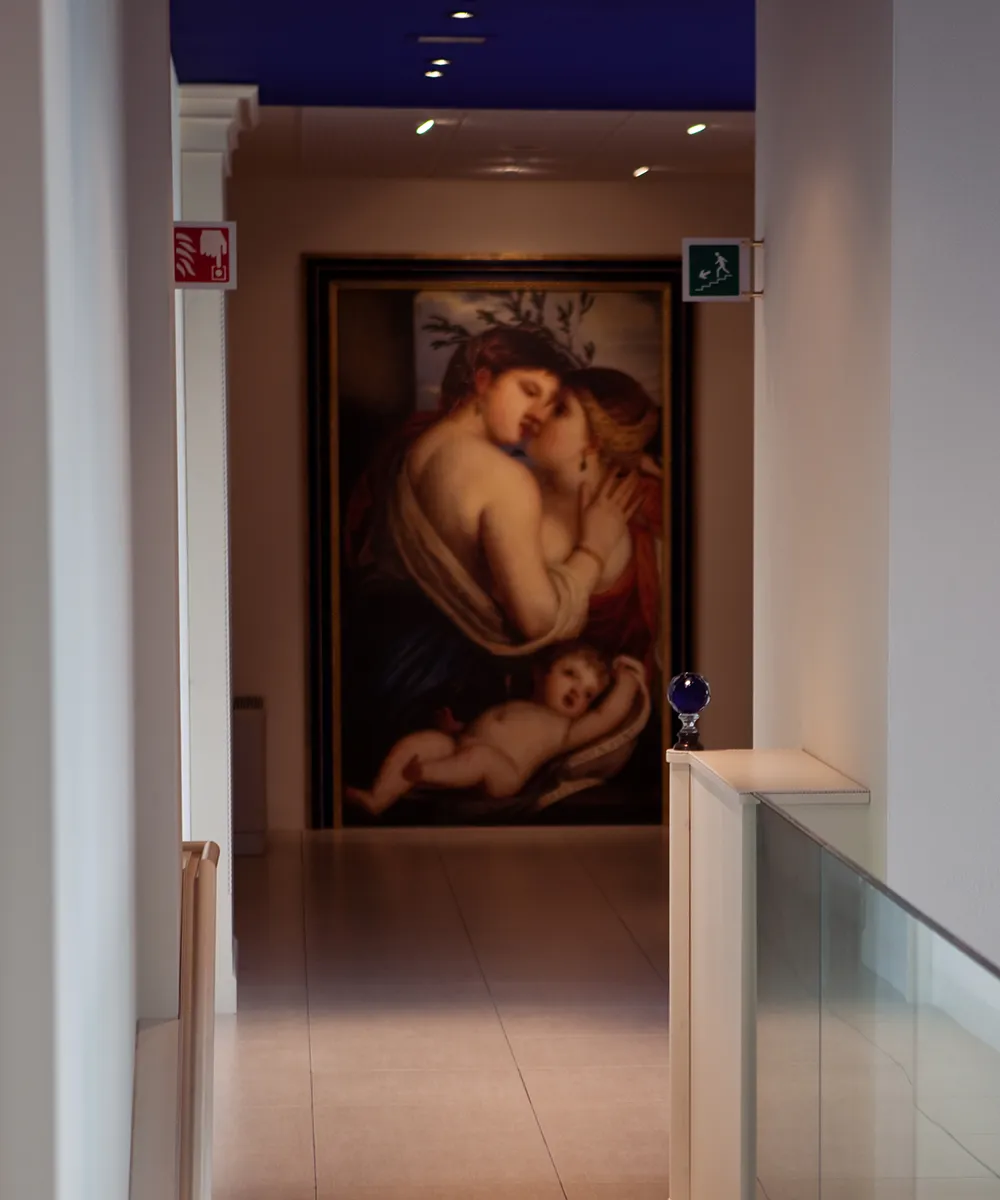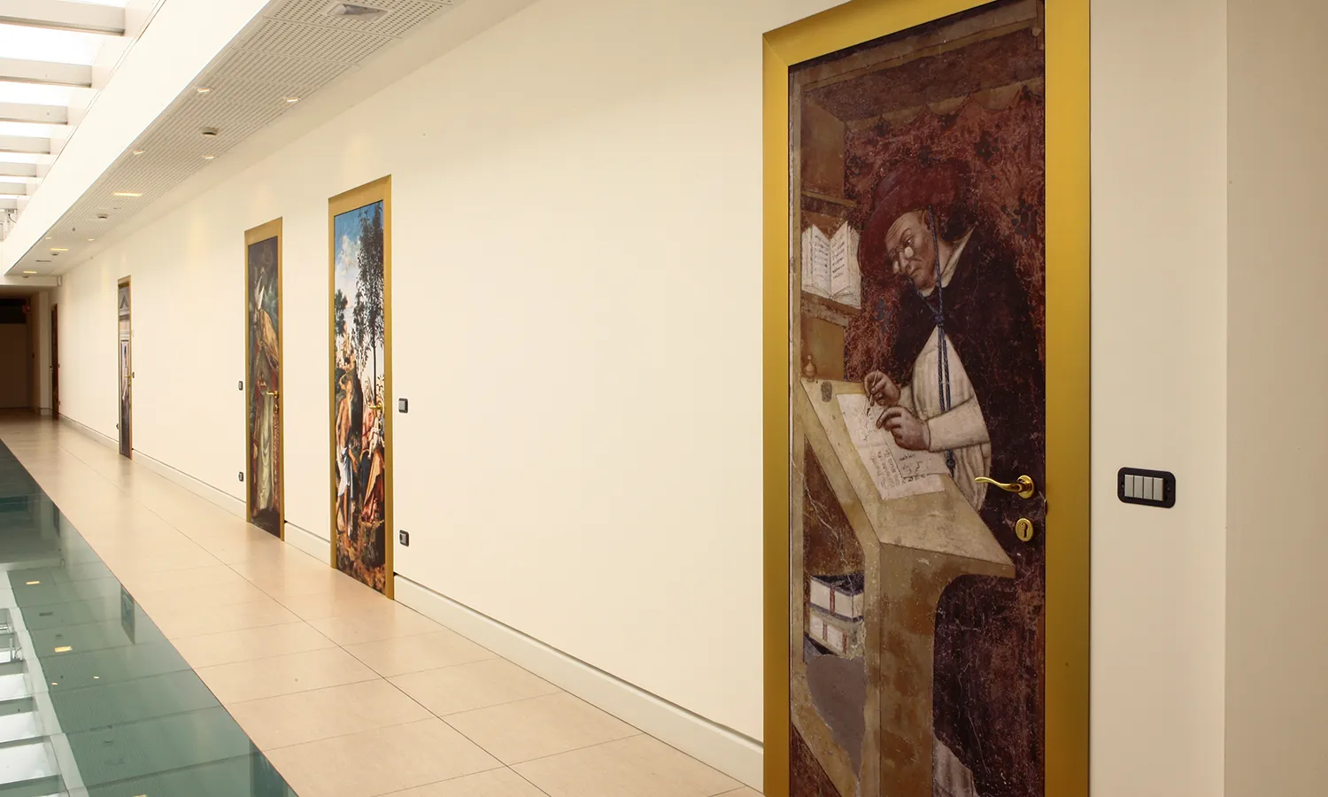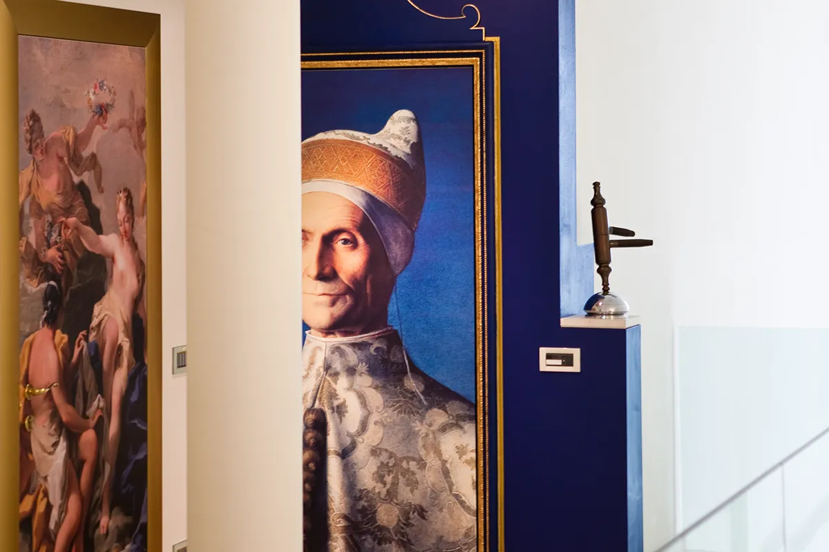 Una delle curiosità più affascinanti di questo progetto riguarda le porte dei singoli uffici, decorate con stampe ispirate ai più celebri dipinti dell’arte veneta. Per ogni ambiente è stato scelto un personaggio storico legato all’area aziendale svolta in quel ufficio, creando così un legame simbolico che unisce arte e lavoro. In questo modo, ogni porta si trasforma in una piccola storia, in un viaggio tra cultura, identità e passione veneta.